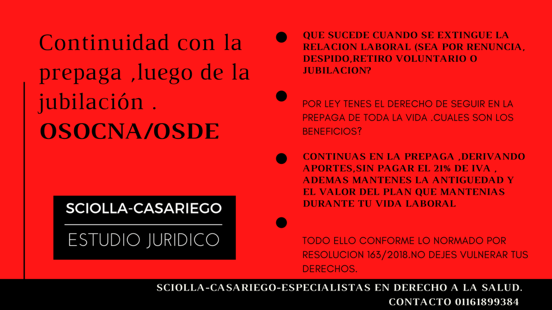 Vino el Sr. G .C quien trabajo toda la vida en Telefónica Argentina ,tenía como obra social OSOCNA ,quien por su parte le proveía como plan superador Osde 210 -al momento de obtener el beneficio jubilatorio- les solicito a ambas entidades que lo mantengan como afiliado a él ,su esposa e hijo menor , sin limitaciones temporales y presupuestarias y solicito continuar derivando aportes .Lo que recibió como respuesta fue una negativa de las mismas ,con la típica contestación que ninguna de las dos aceptaba jubilados y debía continuar con Pami.
