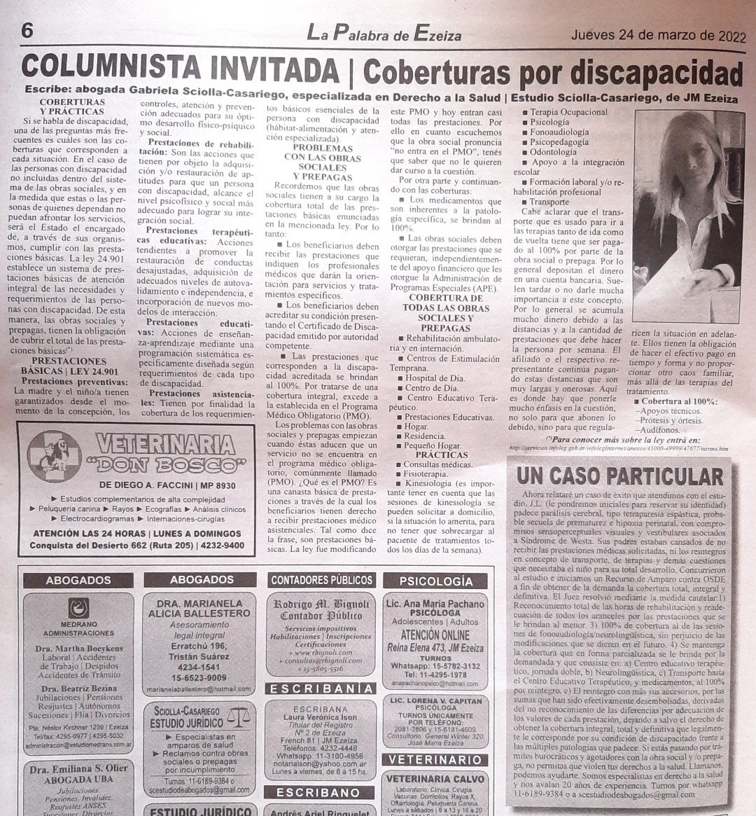 Les dejo una nota del diario La palabra a quien agradezco infinitamente por la misma, donde hablo con más profundidad sobre el tema. Comunícate con nosotros podemos ayudarte .Somos especialistas en derecho a la salud 0116189-9384 o escribinos a estudiodeabogados@gmail.com.