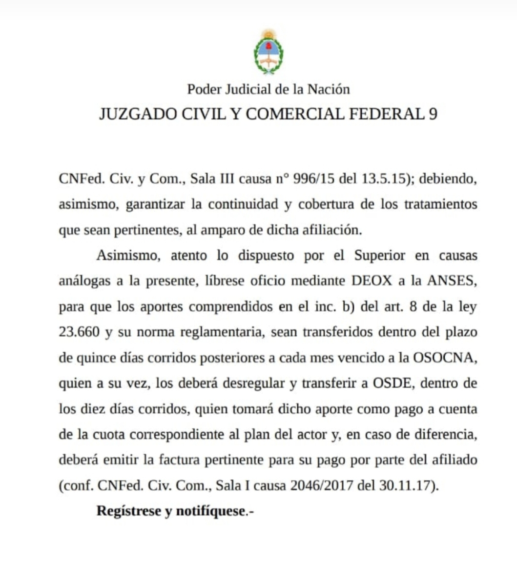 Allí decidimos Iniciar Acción de Amparo en los primeros días de Abril 2022 y con fecha 2 de Mayo de 2022 obtuvimos la medida cautelar donde Vuestra Señoría del Juzgado Civil y Comercial Numero 9 RESOLVIO: Decrétase la medida peticionada, a cuyo fin, dispónese que hasta tanto se resuelva la pretensión planteada en autos, la Obra Social de Comisarios Navales (OSOCNA) y OSDE deberán mantener la afiliación bajo la modalidad del Plan 210 al Sr. E. D, como así también a E D (hijo) –como integrante del grupo familiar primario- (siempre que se cumplan las condiciones del art. 9 de la ley 23.660), lo cual deberá realizarse con los aportes que efectúe la parte actora de conformidad con lo establecido por el art. 16 de la ley 19.032 y 20 de la ley 23.660, sin perjuicio de que, para el caso de que el Plan 210 fuera complementario en los términos del Decreto 576/93, cumpla el accionante con el aporte adicional correspondiente (conf. CNFed. Civ. y Com., Sala III causa n° 996/15 del 13.5.15); debiendo, asimismo, garantizar la continuidad y cobertura de los tratamientos que sean pertinentes, al amparo de dicha afiliación. Firmado Juez Mercedes Maqueira .Fecha 2 de Mayo de 2022.