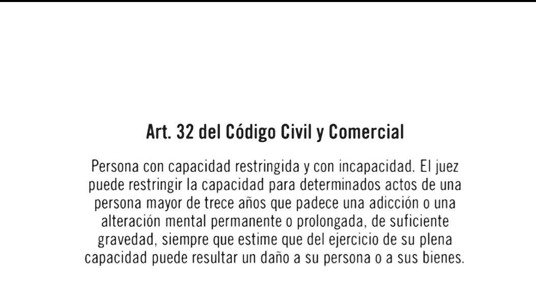 Acá es importante analizar, la capacidad de las  personas, que por más de ser mayores de edad, pueden verse restringidas en el ejercicio de sus derechos. Nuestro ordenamiento jurídico plantea  diferentes situaciones para la restricción de la capacidad jurídica. En el caso de personas con padecimientos mentales, adicciones, etc. Ocurre que en la práctica ciertos actos jurídicos no los pueden hacer por sí mismos, justamente por padecer algún problema con trascendencia mental. Ejemplo, una persona que no puede comprender los alcances de un acto de una compra venta. Por un lado tiene el derecho a vender su  casa pero no comprende el alcance de entender la transcendencia de esa venta.  La ley da la posibilidad que se restringa esa capacidad jurídica. Por lo tanto  prevé la posibilidad de  iniciar un proceso judicial, tendiente justamente a obtener una sentencia donde el juez restrinja en mayor o menor medida esa capacidad jurídica de una persona para el ejercicio  de sus derechos .Aquí el juez evaluara la situación y para el caso, restringirá ciertas situaciones jurídicas, ya no nombrando un Curador como en el viejo Código Civil, sino que nombrara un  APOYO, puede ser cualquier familiar, un hermano, etc. A partir de ese momento esa sentencia se inscribe en el Registro Civil y a partir de ese momento, no es válido, es nulo, un acto jurídico, por ejemplo un contrato que la persona celebre sin la asistencia de su   apoyo. Por lo tanto, a partir de ahora las decisiones van a ser de a dos, la persona con capacidad restringida más el apoyo. La persona da su consentimiento y su apoyo el asentimiento, el aval, la autorización para que el acto se lleva a cabo. Por ejemplo si la persona quiere vender un departamento, si la persona fuera plenamente capaz, la persona  vendedor, firmaría por si solo la escritura y el comprador la compraría. En cambio al ser una persona con capacidad restringida, y en la sentencia entre los actos que la sentencia limita, están los actos de disposición de bienes, por ejemplo la venta de un departamento. Esto significa que, tengo que firmar la escritura porque soy quien da el consentimiento, pero mi apoyo también firma porque da el asentimiento, dando un aval para que se celebre el acto.