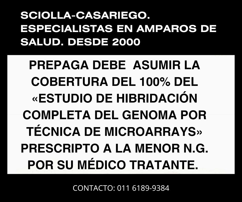 El Sr. Juez de primera instancia hizo lugar a la acción de amparo interpuesta y condenó a Organización de Servicios Directos Empresariales (OSDE) a asumir la cobertura del 100% del «estudio de hibridación completa del genoma por técnica de Microarrays» prescripto a la menor N.G. por su médico tratante.