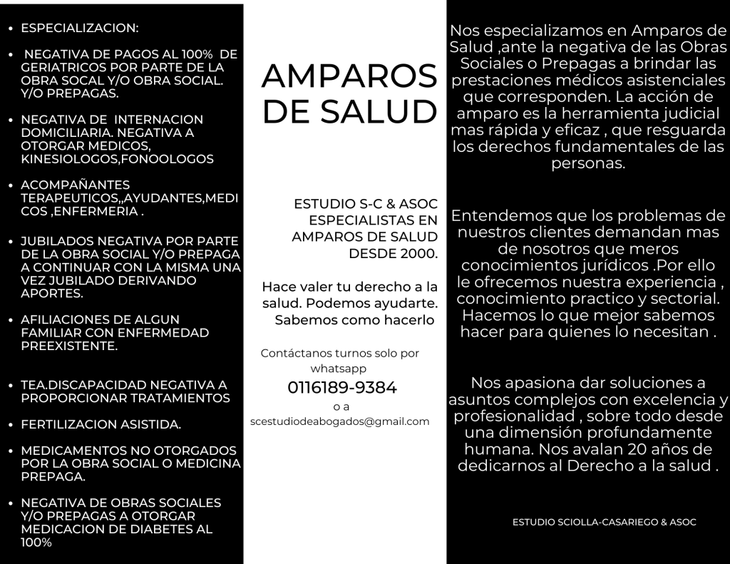 Si estás pasando por una situación similar podes contactarnos al 011 61899384.Hace 24 años somos especialistas en Amparos de Salud .Podemos ayudarte. Estudio Sciolla-Casariego.